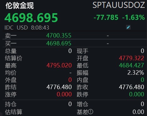 2月6日,现货黄金继续下跌,截至发稿跌1.63%,向下跌破4700美元/盎司;现货白银跌5.86%,报66.55美元/盎司,昨日收跌逾20%。