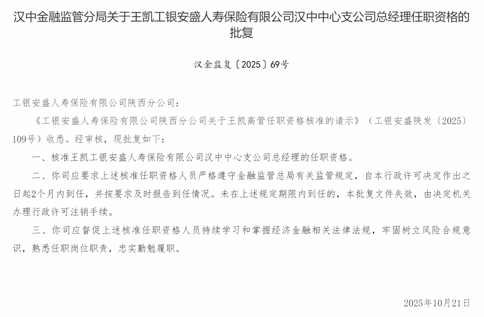 10月28日,汉中金融监管分局发布关于王凯工银安盛人寿保险有限公司汉中中心支公司总经理任职资格的批复,核准王凯工银安盛人寿保险有限公司汉中中心支公司总经理的任职资格。