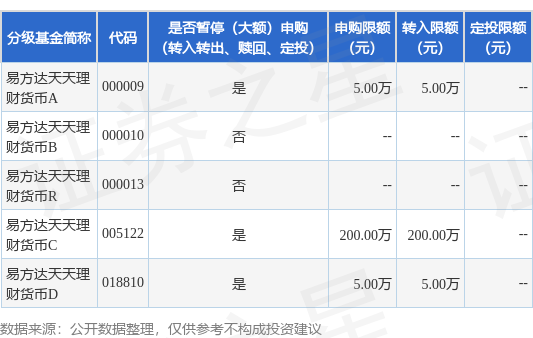 本站消息,9月24日易方达基金管理有限公司发布《易方达天天理财货币市场基金A类基金份额、C类基金份额、D类基金份额在非直销销售机构调整大额申购及大额转换转入业务限制的公告》。公告中提示,为了基金的平稳运作,保护基金份额持有人利益康乾配资,自2025年9月29日起易方达天天理财货币市场基金A类基金份额、C类基金份额、D类基金份额在非直销销售机构调整大额申购及大额转换转入业务限制,下属分级基金调整明细如下: